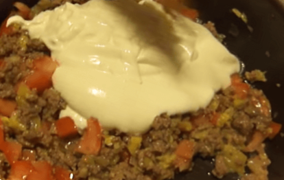 Сметана додасть соусу ніжну консистенцію.Соус солимо, посипаємо перцем і коли сметана розійдеться, соус буде готовий. Водночас вода в каструлі з кабачками починає кипіти. Додаємо до них соус, розподіляємо його по всій поверхні, щоб він не був грудкою.