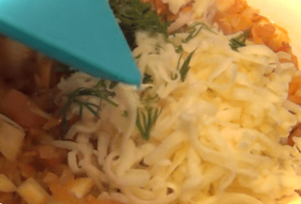 Наприкінці додаємо в начинку натертий сир і дрібно нарізану зелень. Добре перемішуємо, щоб усі продукти розподілилися рівномірно.