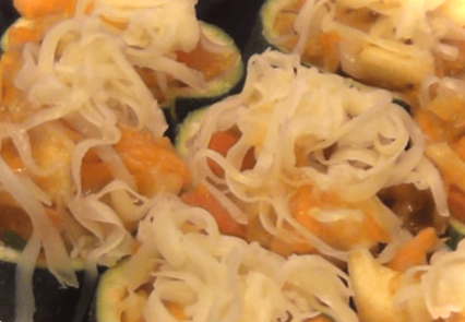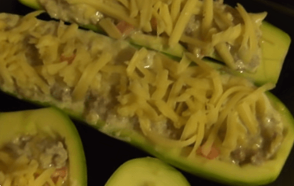 Змащуємо лист або форму для запікання олією. Викладаємо човники з кабачків на лист і заповнюємо їх готовою начинкою. Зверху посипаємо натертим сиром.