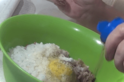 До м'ясного фаршу додаємо відварений рис, яйце, солимо і перчимо його, добре перемішуємо. На якийсь час відставляємо убік.