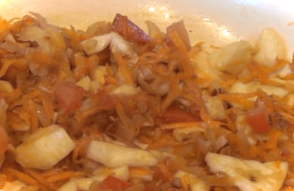 Робимо соус. Для цього дрібно нарізану цибулю обсмажуємо до прозорості на сковороді з маслом, потім туди ж додаємо моркву і обсмажуємо доти, доки морква не стане м'якою. Додаємо до цибулі та моркви заморожені помідори, а потім сметану.