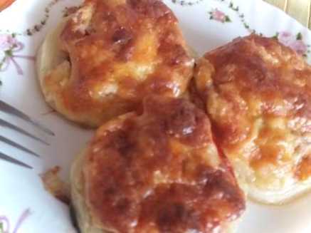 Середину кружальців заповнюємо м'ясною начинкою, верхній шар має бути на одному рівні з краями кружальців.