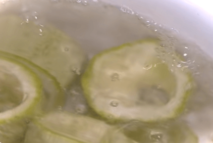Нарізаємо овоч кружальцями, ложкою дістаємо середину. У той же час доводимо до кипіння 2-3 літри води в каструлі, додаємо до смаку сіль. Опускаємо в окріп підготовлені кабачкові кільця. Вимикаємо вогонь і залишаємо кабачки у гарячій воді на 10 хвилин.