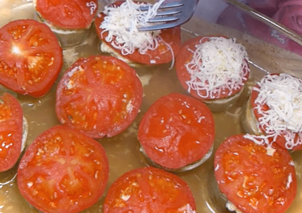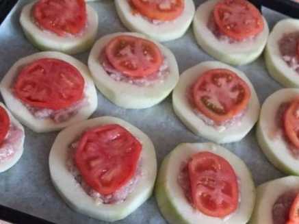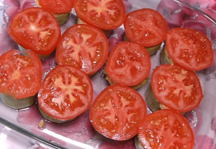 Зверху на кожен кабачок кладемо по кружечку помідорів.