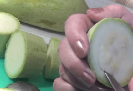 Якщо у вас молоді овочі, шкірку з них очищати не треба. На старих доведеться це зробити, оскільки шкірка на них вже груба. Нарізаємо кабачки кружальцями висотою приблизно 3-4 см, щоб їх потім було зручно начиняти. Середину очищаємо ложкою або вирізаємо ножем.