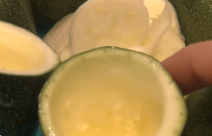 Кожен кабачок розрізаємо вздовж на 2 частини. Виймаємо ложкою серцевину з половинок