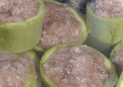 Фаршируємо приготованою начинкою і складаємо кружальця в каструлю, можна один на одного. Наливаємо в каструлю воду вище кабачків на 2 см, трохи воду солимо. Включаємо під каструлею вогонь, щоб вони почали вже гаситись.