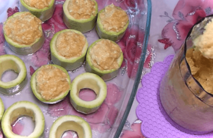 Через 10 хвилин, з кабачків зливаємо воду та розкладаємо їх у формі для запікання. Заповнюємо їх приготованою начинкою.