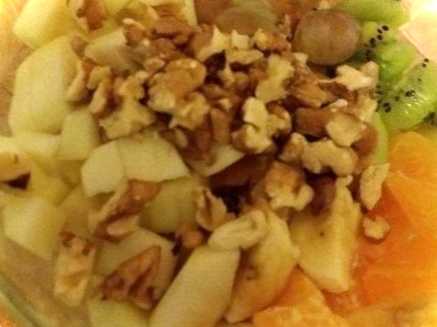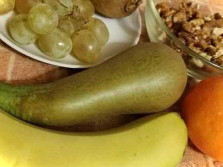 Очищені фрукти нарізаємо невеликими шматочками. Дрібно нарізати не потрібно, інакше десерт виглядатиме з йогуртом, як негарне місиво. Нарізані плоди складаємо в окрему салатницю. Туди ж додаємо ягоди винограду. Якщо виноградинки дуже великі, їх розрізають навпіл. Волоські горіхи подрібнюємо, і додаємо їх до інших інгредієнтів.