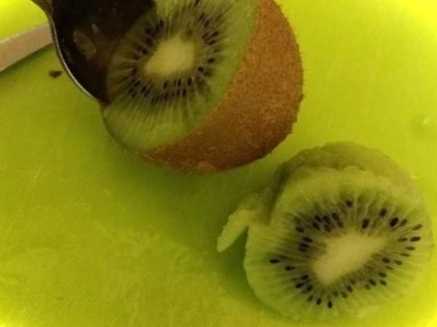 Ківі можна почистити так. Розріжте плід упоперек на 2 частини, а потім, встромивши чайну ложку під шкірку, обертальним рухом дістаньте м'якоть. Вийде швидко і красиво.