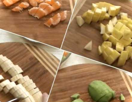 Насамперед усі фрукти та виноград миємо під проточною водою і протираємо паперовим рушником, щоб прибрати вологу з них. Очищаємо їх від шкірки, у тому числі й грушу. Звичайно, на ній можна залишити шкірку, але тоді вона відчуватиметься, що буде не дуже приємно. Грушу можна замінити яблуком, або ж додати ще яблучко.