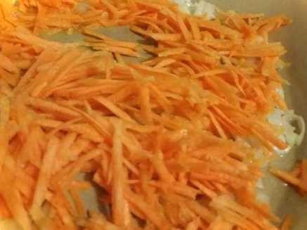 Потім до нього додайте натерту моркву, і продовжуйте смажити разом із цибулею.