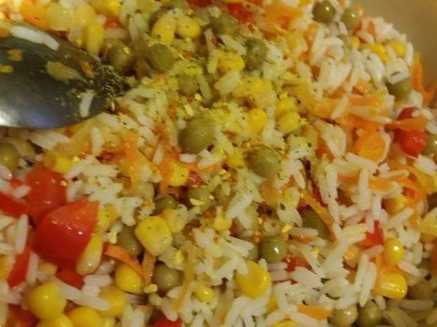 До цього часу рис має бути готовим. Зливаємо з нього воду, відкинувши його на друшляк, а потім додаємо до овочів. Туди ж додаємо відціджені від рідини кукурудзу та зелений горошок. Солимо, додаємо улюблені спеції до смаку, перемішуємо. Я додала приправу Вегета, що ви додаватимете, вирішуйте самі.