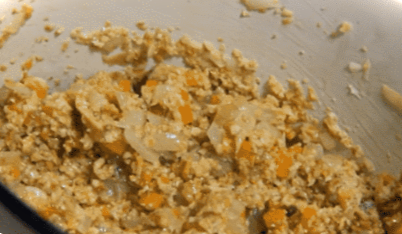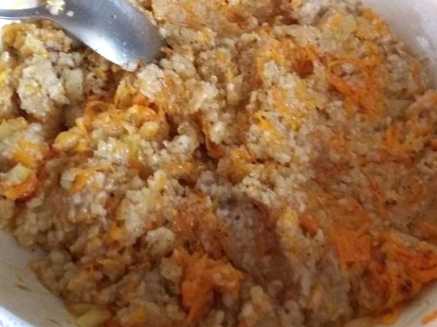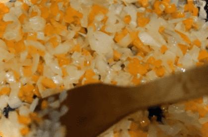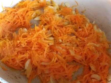 Цибулю обчищаємо і дрібно нарізаємо. Обсмажуємо його на сковороді з олією до прозорості. Моркву натираємо на тертці і відправляємо на сковороду до цибулі і смажимо доти, доки морква не стане м'якою.