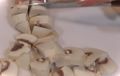 Нарізаємо шматочками печериці і відправляємо до овочів на сковороду.