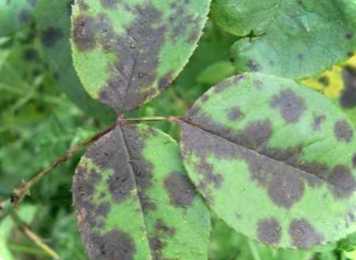 - Чорна плямистість: на неї вказують темні, майже чорні плями на верхньому боці листя. При цьому знизу вони жовтіють та засихають. Як і багато інших грибкових шкідників сільськогосподарських рослин, чорна плямистість повинна мати вільний доступ до води на поверхні рослин, у вигляді крапель або водяної плівки, щоб розмножуватися і поширюватися далі. Тісне висаджування, підвищена вологість та надмірний полив допомагають чорній плямистості розвиватися швидше.