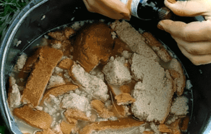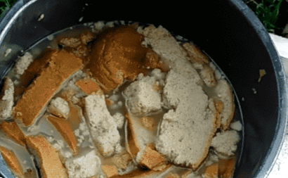- 1 буханець або батон чорного хліба розрізається на скибочки або невеликі шматочки і замочуються в 10 л теплої води,