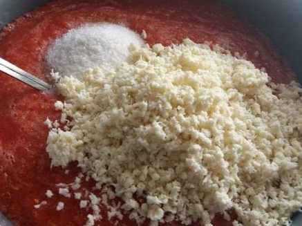 - Овочеву масу солимо, додаємо цукор, добре перемішуємо. Місткість із сумішшю ставимо на плиту і на слабкому вогні варимо 5 хвилин з моменту закипання. У процес варіння додаємо оцет. Якщо варити довше, то маса вийде густішою.