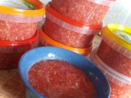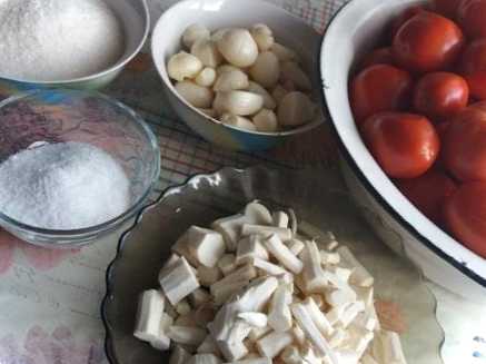 При приготуванні стоїть завдання: усі чисті продукти подрібнити, потім змішати та додати спеції. У помідорів видаляємо плодоніжки і ріжемо шматочками, щоб вони проходили в м'ясорубці. Пропускаємо через м'ясорубку.