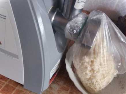 Одночасно прокручуємо хрін та часник. Щоб уникнути негативних наслідків при подрібненні коріння, коли їх прокручуємо, наробимо на м'ясорубку поліетиленовий мішок або подрібнюємо його в блендері. Щоб коріння краще подрібнилося, тому що його структура волокниста, їх нарізають невеликими шматочками, а ще в блендер додають один перчик.