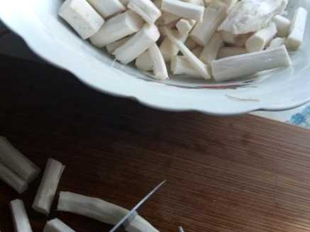 Коріння очищають від шкірки та дрібних бічних корінців. Товсте коріння нарізають кільцями завтовшки не більше 2 см. Тонкі коріння нарізають шматочками не більше 5 см, це необхідно робити для того, щоб вони не загорнулися довкола шнека в м'ясорубці.