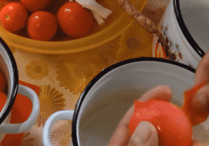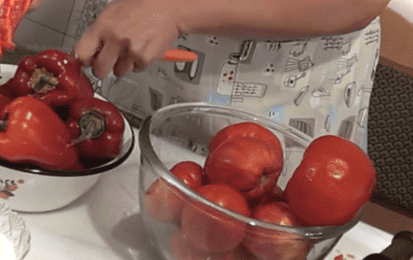 - Спочатку готуємо овочі. Помідори заварюємо окропом, даємо їм постояти 5 хвилин, а потім знімаємо з них шкірку. Нарізаємо шматочками.