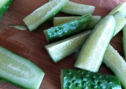 Корнішони миємо, обрізаємо кінчики. Якщо використовуєте салатні сорти, наріжте брусочками їх довжиною не більше 10 см. Потім плоди наріжте вздовж на 4 частини.