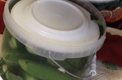 Щоб плоди не спливали, зверху прикриваємо вантажем, наприклад, перевернутою тарілкою, а потім ємність закриваємо кришкою.