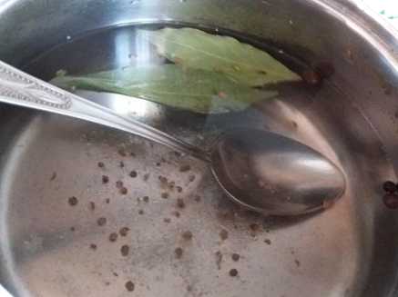 Приступаємо до приготування розсолу. Для його приготування знадобиться гаряча вода, а не окріп. У мене чайник скипів хвилин 5-10 тому. Гарячу воду наливаємо в невелику каструлю, туди додаємо сіль, цукор, нарізаний часточками часник, лавровий лист, запашний перець та подрібнені зерна коріандру. Кріп можна дрібно порізати, або просто повністю покласти гілочки. Коріандр можна потовкти у ступці, я ж за її відсутністю подрібнила просто качалкою на обробній дошці.