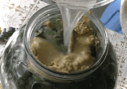 Насипаємо в банку з огірками 1 ст. л. сухого гірчичного порошку. Гірчиця має знезаражуючу властивість і надасть плодам хрускіт. А потім у банку наливаємо холодну солону воду.
