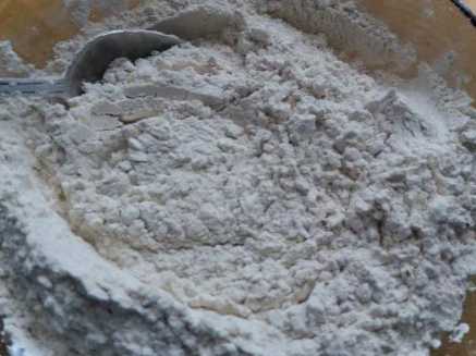Борошна трохи потрібно залишити, щоб припилити поверхню, на якій далі вимішуватимемо тісто.Якщо тісто занадто м'яке і липне до рук, можна ще додати борошна. Загалом вам знадобиться від 250 до 300 грам борошна.