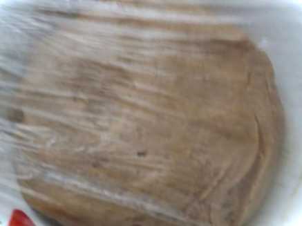 Формуємо тісто в шар (воно поки що м'яке), перекладаємо в чашку, прикриваємо харчовою плівкою і відправляємо в холодильник на пару годин, в ідеалі можна і на ніч. Після холодильника тісто буде твердішим і його легше розкачувати.