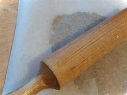 На поверхню кладемо пергамент і на ньому розгортаємо тісто завтовшки 3-4 мм. Щоб тісто добре розкочувалося, покладіть зверху ще один лист пергаменту.
