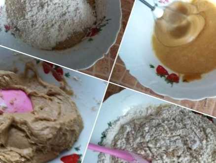 В іншій чашці розмішуємо розм'якшене масло та цукровий пісок, збиваємо їх міксером до отримання пишної маси. Коли олія з цукром посвітлішає, додаємо 1 яйце і продовжуємо збивати. Додаємо до яєчно-олійної маси злегка підігрітий мед, У мене був грішний мед, тому він такий темний.