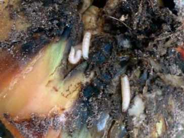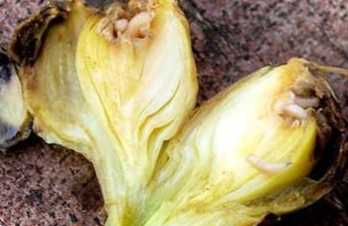 Пошкоджені рослини відстають у рості, цибулина стає м'якою, загниє, видає неприємний запах. Листя рослини в'януть, набувають жовтувато-сірого відтінку, а потім засихають. Зрозуміло, що рослину після цього вважають загиблими.