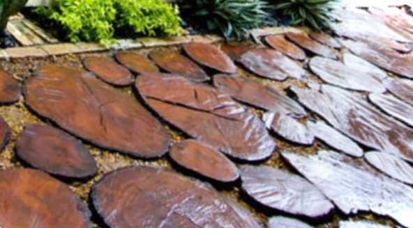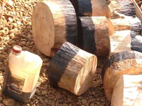 - Просочення матеріалу. Для того, щоб деревина служила довше і не піддавалася швидкому руйнуванню під впливом вологи, її потрібно обробити. Обробляють дерево мідним купоросом, оліфою, бітумом. Після того, як спилки оброблені певним засобом, необхідно просушити їх, тільки після цього матеріал можна використовувати в будівництві доріжок.