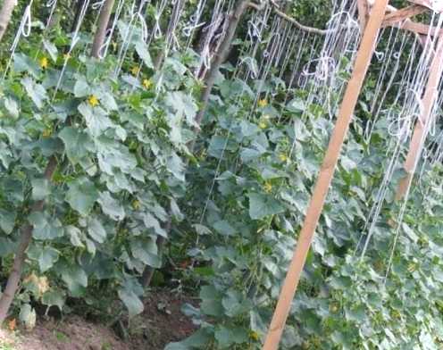 Перевагою є те, що у вас вже є готовий каркас, у його ролі виступає конструкція самої теплиці. У верхній частині є дуги, у нижній, грядки. У землю необхідно забити вигнуті кілочки, дерев'яні бруски, будь-який інший матеріал, до якого можна буде прив'язати шпагат. Кільця слід розташовувати в безпосередній близькості з кущами огірків, щоб батіг зміг зачепитися за нього і спрямувати вгору. Поруч з кожним кущем слід опустити відразу 2 шпагату в V-подібному вигляді. В результаті цього огірки будуть прагнути і зможуть швидко досягти самої верхівки теплиці. Це збільшить кількість сонячного світла, що входить на завод, підвищить продуктивність та спростить збір огірків.