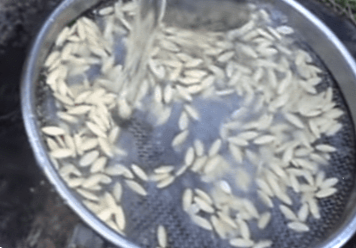 Для видалення оболонки з насіння через 3 дні в банку додаємо воду. Ретельно розмішуємо вміст, так оболонка, що залишилася, краще руйнується і добре відшаровується від насіння. У воді повноважне насіння опускається на дно. Інші, не несуть у собі паростка, спливають на поверхню, їх просто прибирають.