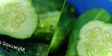 Зі зібраних огірків вибирають жіночі плоди. Саме з них збирається майбутнє насіння. Перевірте всі огірки та залиште квадратні – жіночі 4-х камерні плоди. Чоловічі плоди бувають 3-х камерні. Подивіться, як вони виглядають на фото.