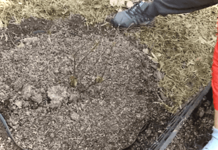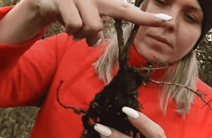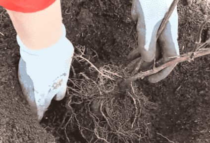 Саджанець з голим корінням краще спочатку замочити в розчині природних стимуляторів. Якщо у рослини довгі коріння, їх можна трохи вкоротити. Якщо уважно подивитися, то основа саджанця має розвилку гілок, висаджуючи, її потрібно заглибити. Або саджанець садять у нахил і заглиблюють до наступної бруньки. Тобто при посадці саджанець заглиблюють на 5-7 см.