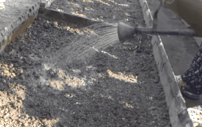 Оскільки земля під час підготовки грядки була полита, і саджанці були у воді, додатково поливати лунки водою не потрібно. Коли всі кущики будуть висаджені, грядку поверх покривного матеріалу ще раз поливають із лійки.
