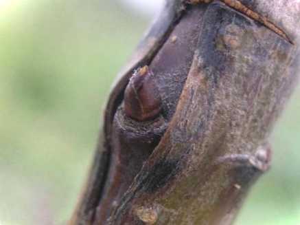 - Готуємо бруньку з дерева потрібного сорту. Вибираємо здорову та масивну нирку в будь-якому місці дерева, після чого зрізаємо її під стовбур. Потрібно отримати розмір, який відповідає надрізу на саджанці.
