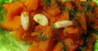 - Гарбуз очищаємо від шкірки та насіння, нарізаємо скибочками. Часник дрібно подрібнюємо.