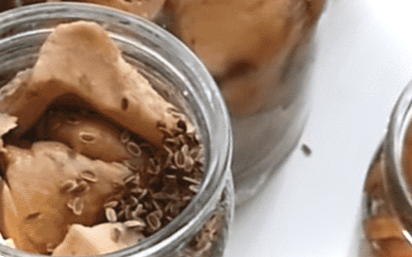 - У підготовлену чисту банку на дно поклала парасольку кропу, а зверху поклала гриби капелюшками донизу. Між шарами розкладала скибочки часнику. Зверху прикрила листочком хрону, він надає грибам хрускіт та аромат.