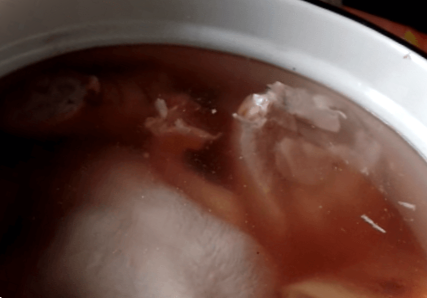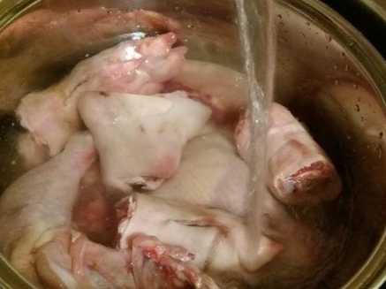 З вечора свинячу гомілку та курку замочуємо у холодній воді, щоб якомога більше вийшла кров із м'яса.