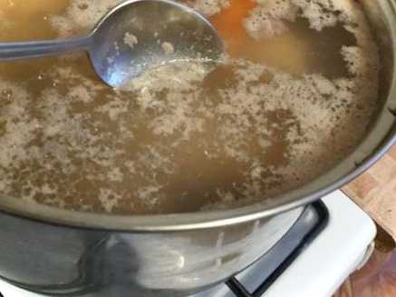 Вранці м'ясо ще раз добре промиваємо водою, розрізаємо на менші шматки (або надрізаємо), складаємо у велику каструлю і заливаємо холодною водою. Ставимо на вогонь. Коли вода в ксстрюлі почне закипати, на поверхні з'являється піна, її потрібно прибрати, якщо хочете, щоб бульйон вийшов прозорим.