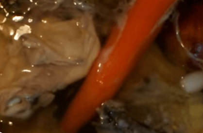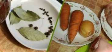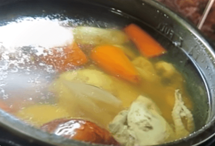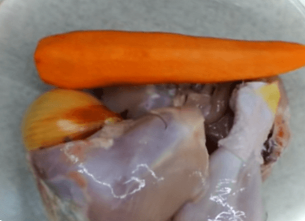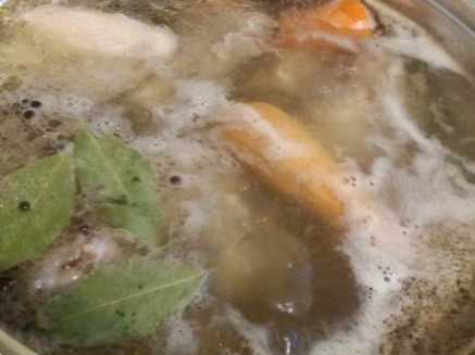 Складаємо всі продукти в каструлю, заливаємо водою і ставимо на вогонь, чекаємо, коли закипить. З бульйону, що закипіло, прибираємо піну, так бульйон залишиться прозорим. Коли вода в каструлі википить достатньо, дістаємо з бульйону моркву, вона знадобиться для прикраси страви. У цей же час солимо бульйон, додаємо лавровий лист і запашний перець.