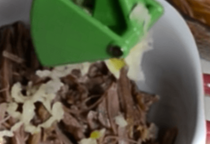 Коли м'ясо звариться повністю, дістаємо його з бульйону, щоб відокремити його від кісток. А в окремій філіжанці желатин заливаємо бульйоном, розмішуємо, щоб кристали повністю розчинилися. Якщо кристалики залишаться, то процідіть рідину через ситечко, а потім додайте до решти бульйону і розмішайте.