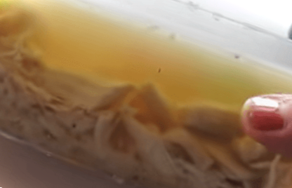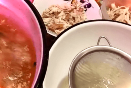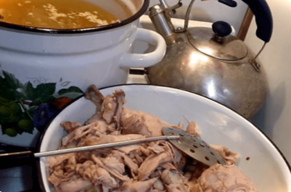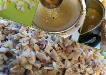 Тим часом розбираємо м'ясо. Кісточки складаємо окремо, м'ясо розбираємо на дрібні волокна та розкладаємо його за окремими ємностями. Бульйон проціджуємо через ситечко та процідженим заливаємо м'ясо.