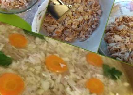 Готове м'ясо дістаємо з бульйону, даємо йому трохи охолонути, а сам бульйон проціджуємо через часте сито, щоб у бульйон не потрапили дрібні кісточки та жиринки. На бульйоні у міру остигання утворюватиметься шар жиру, його можна зняти ложкою.